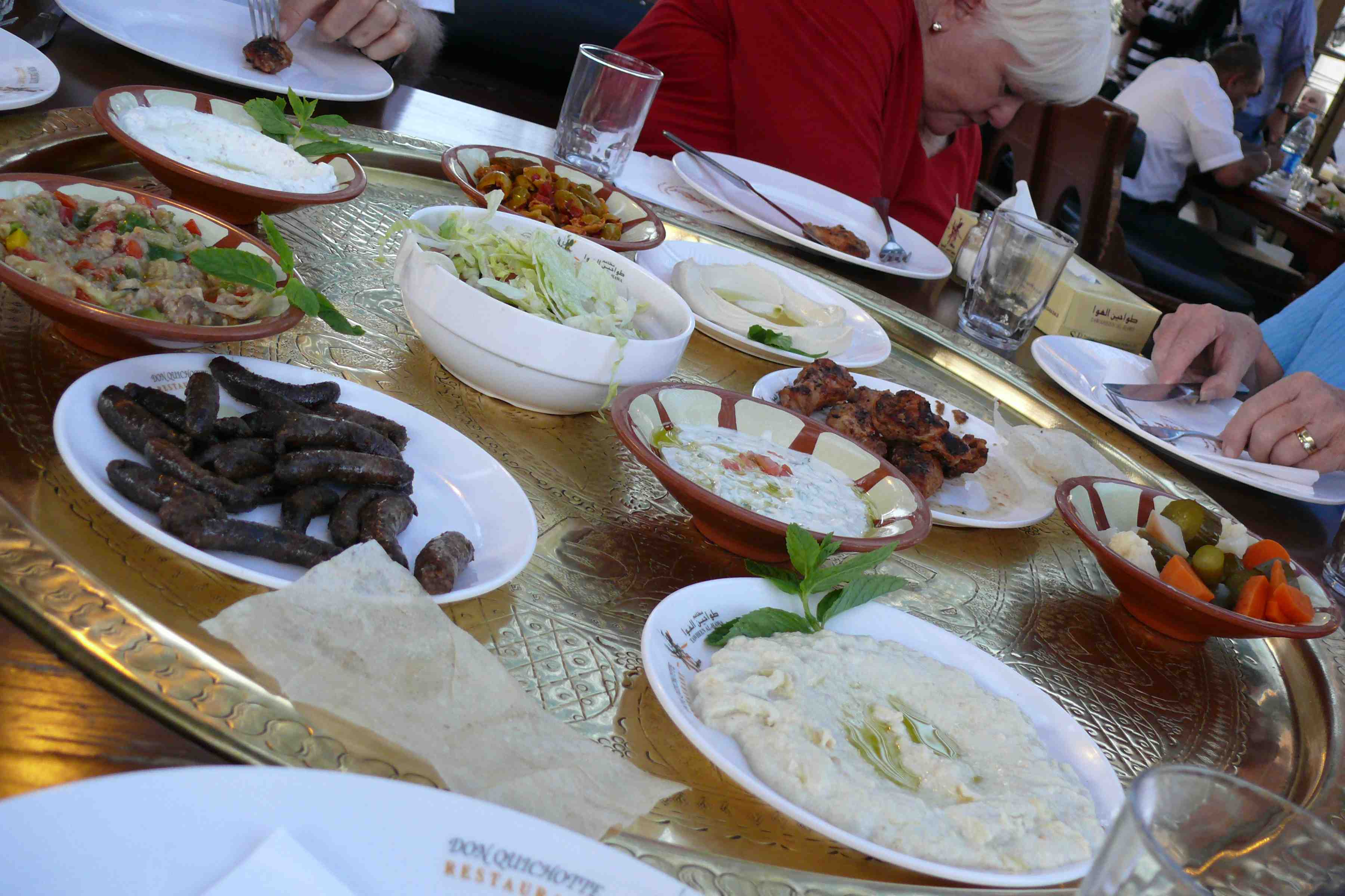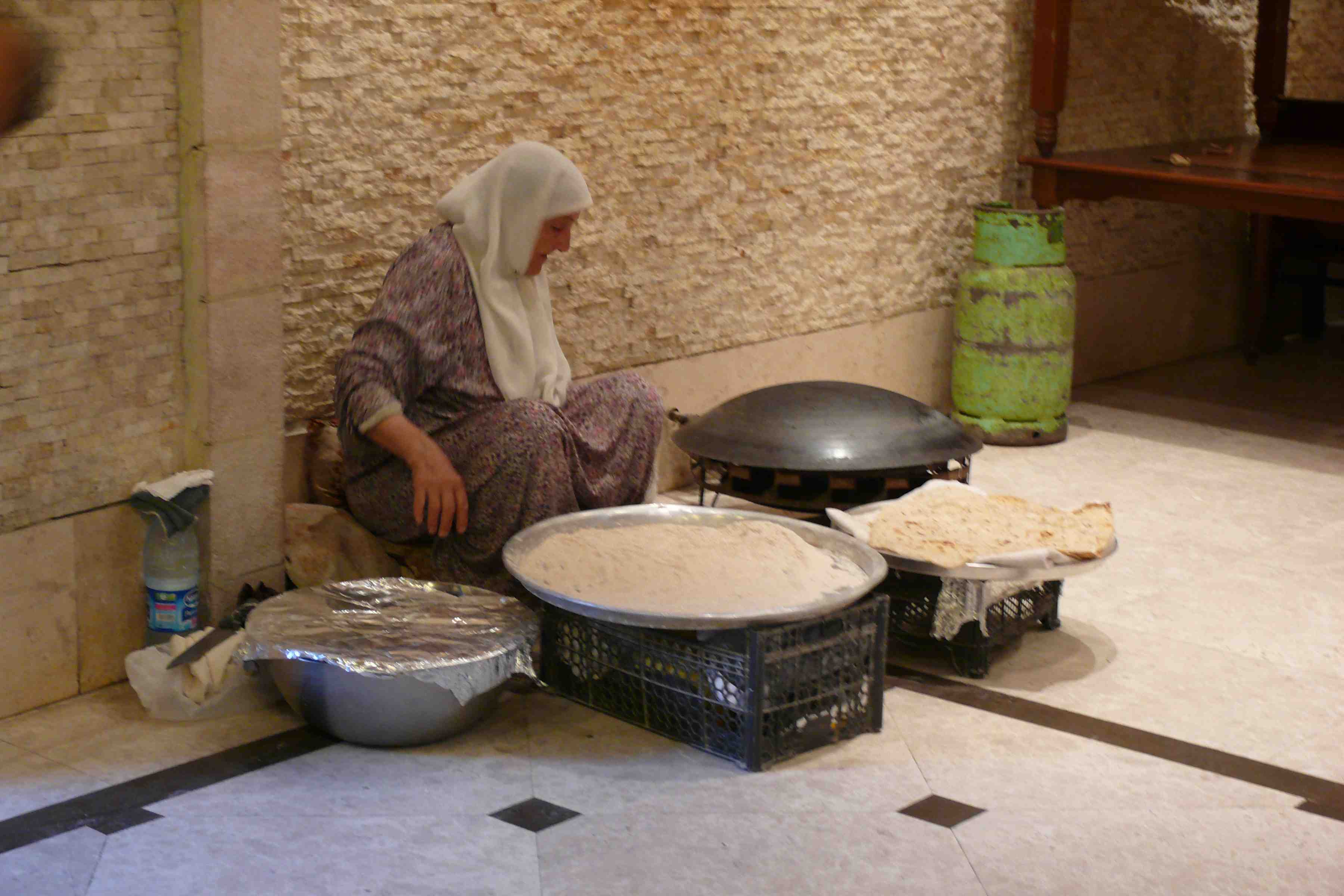 P1100441Rabi then showed us a little of the city before we went to a local Jordanian restaurant and had a wonderful time trying some genuine local dishes. In the foyer of the restaurant there was an old Jordanian lady making the bread for the patrons that night. P1100444She must have been very busy as it’s a huge restaurant. We thoroughly enjoyed the meal in the upstairs section, complemented by a beautiful desert