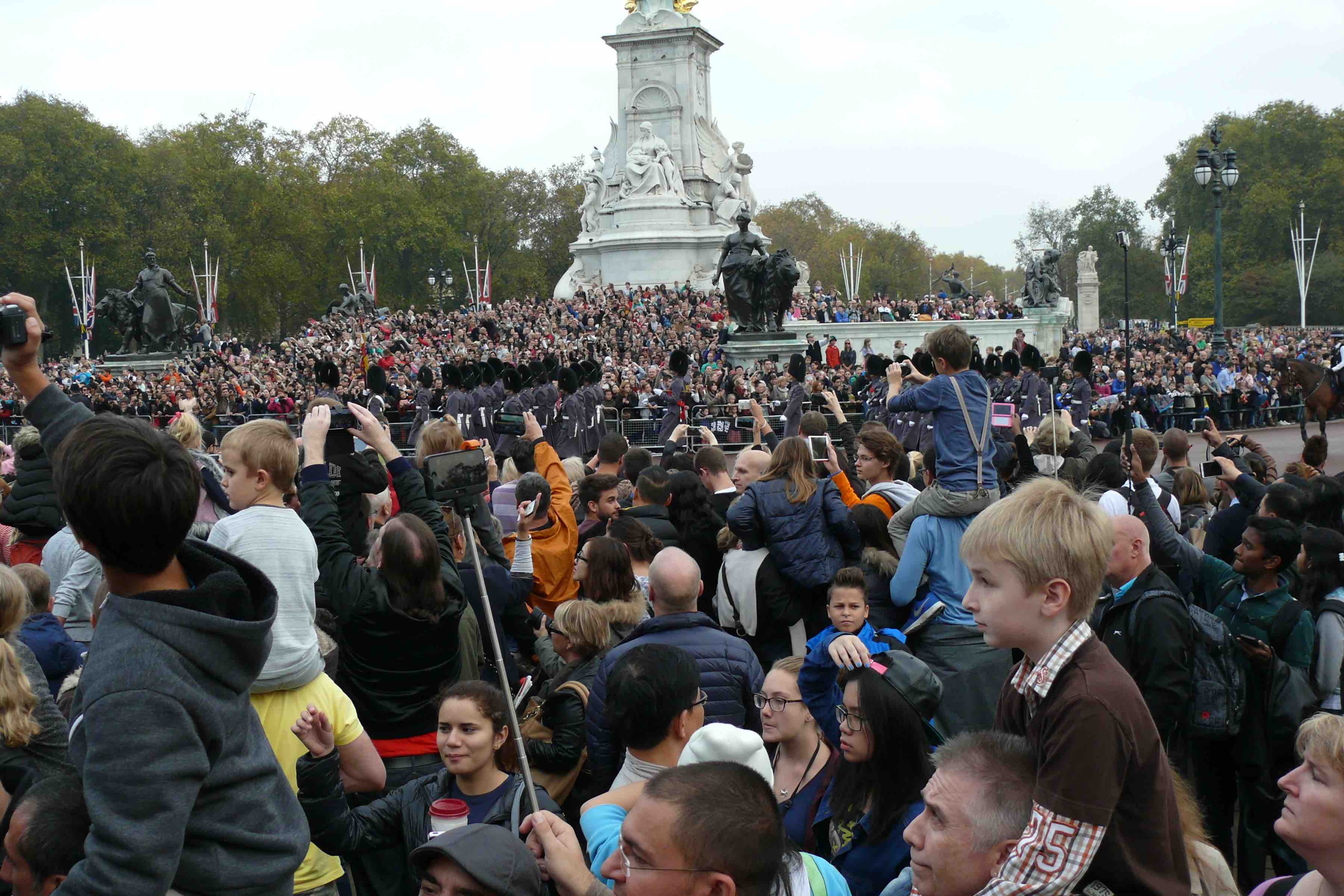 Buckingham Palace only happens every second day, but what an enormous crowd was present the day we went. We got two marching bands arriving from different directions into the Queen Victoria forecourt and then into the palace grounds.